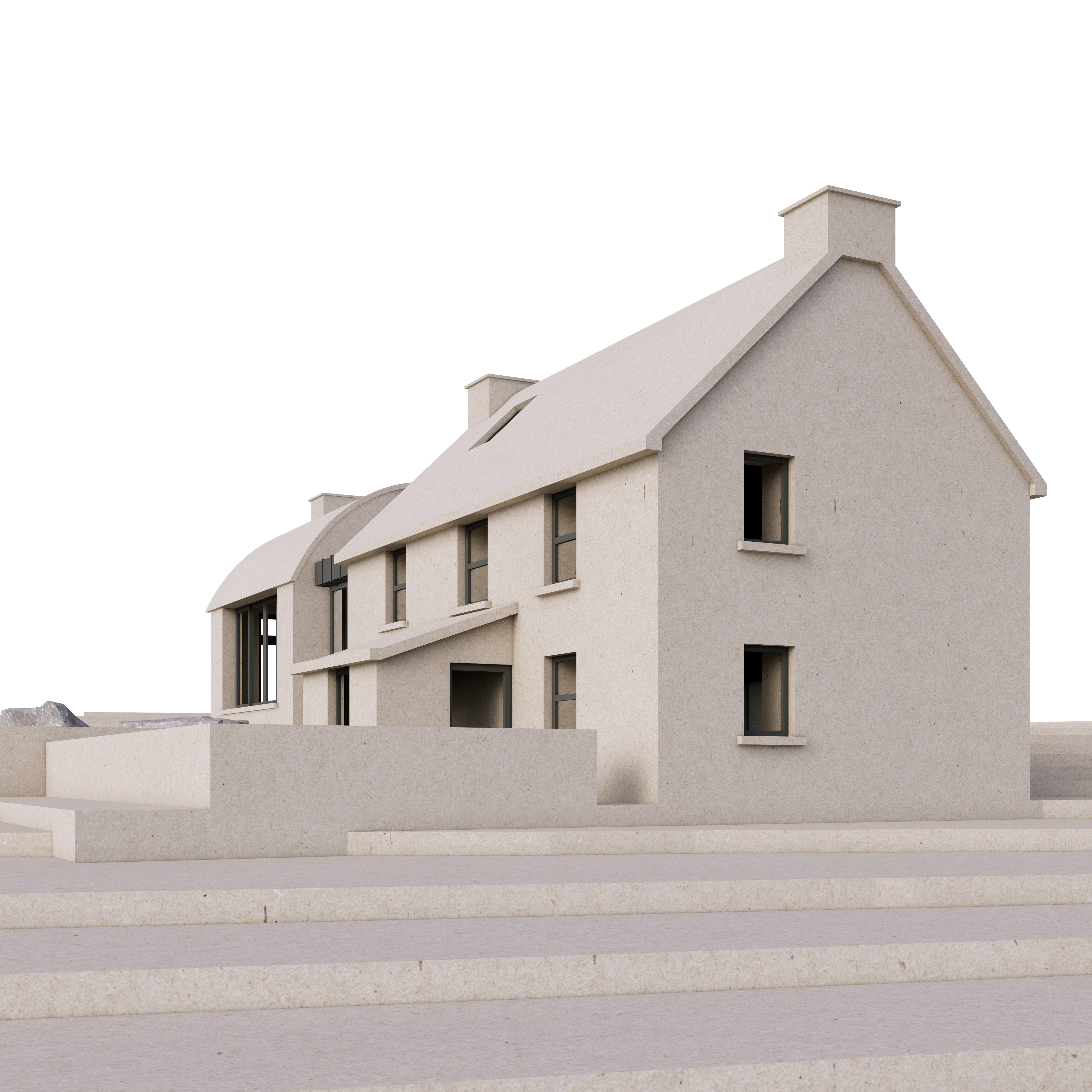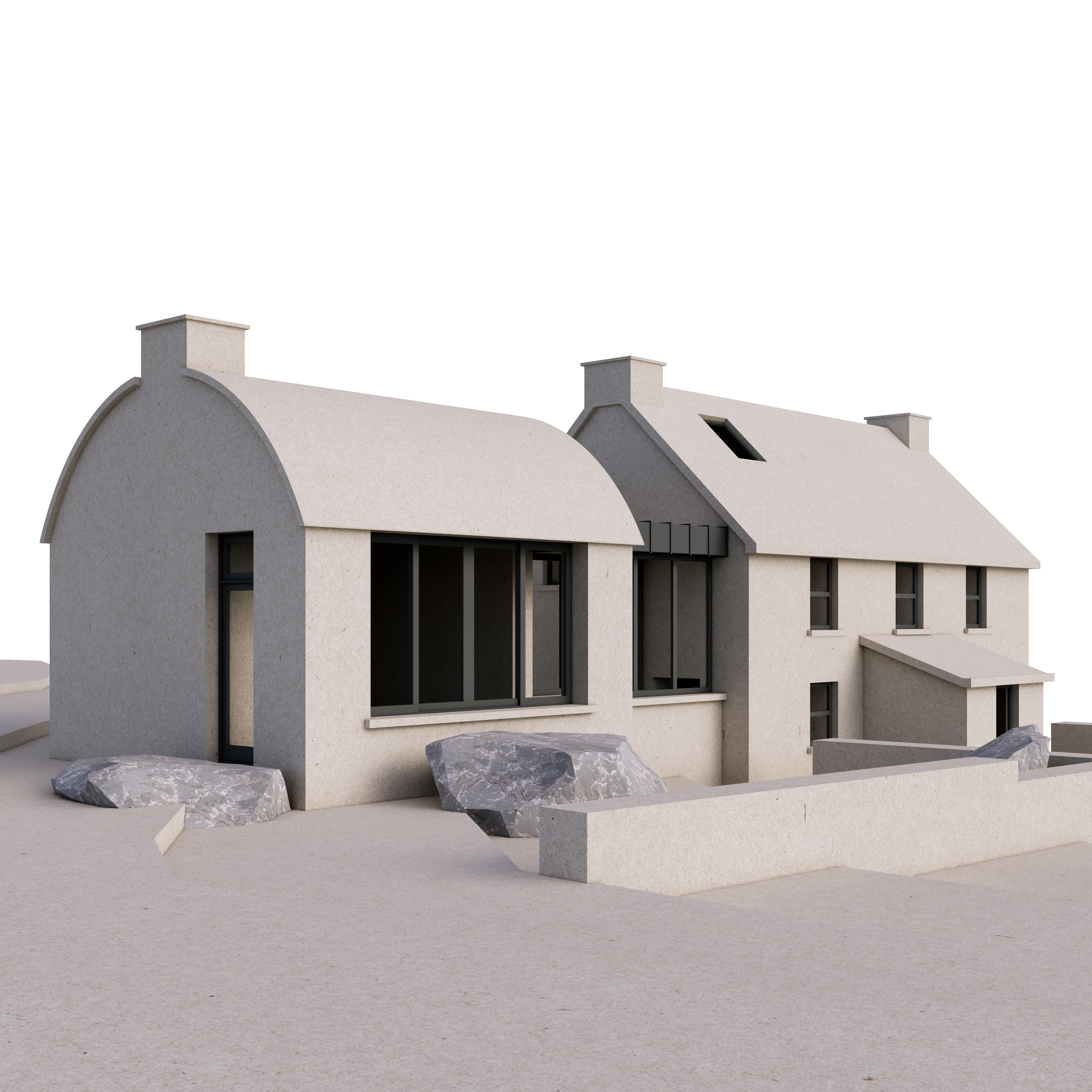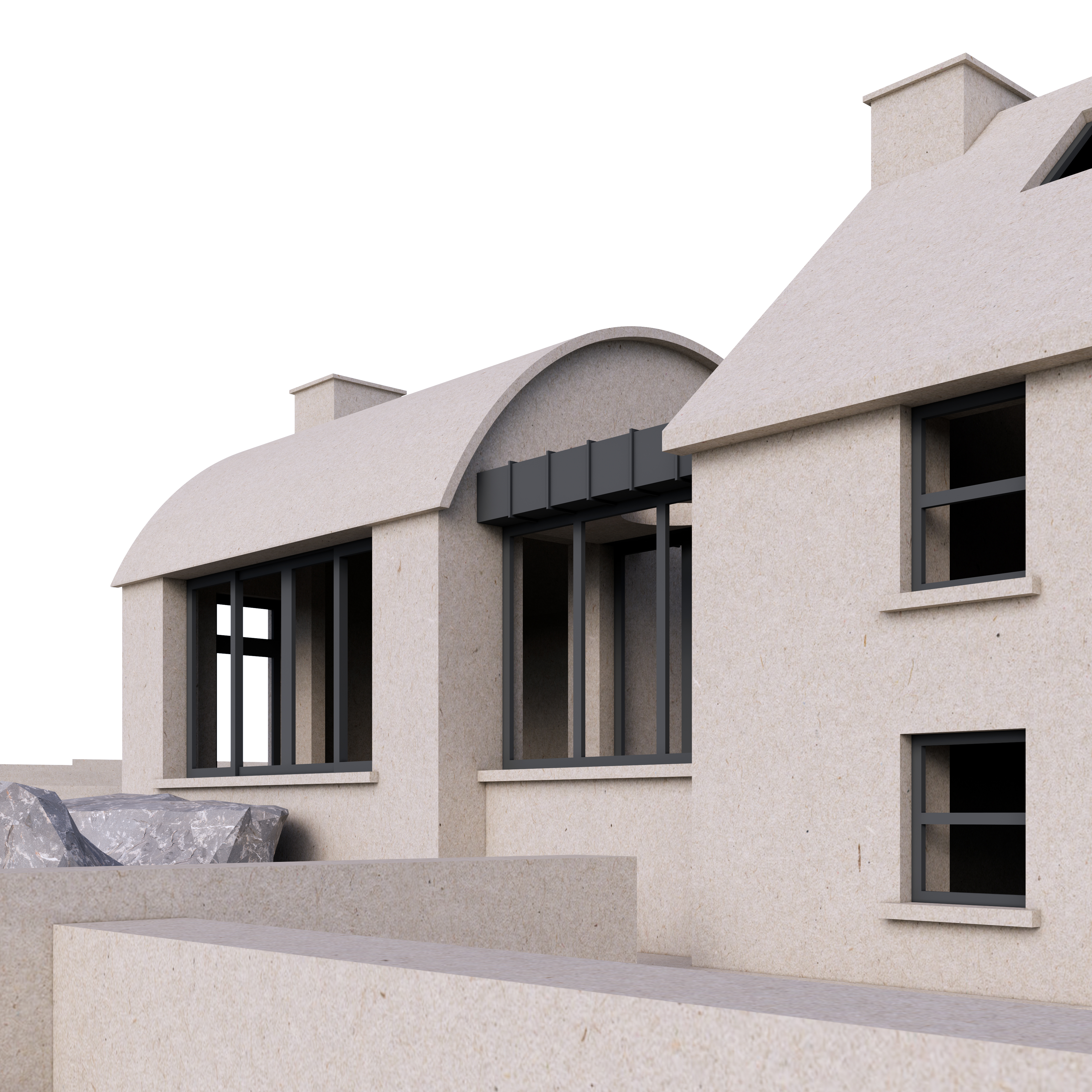 The new addition draws formal and material inspiration from the single-barrel-vaulted hay barns once typical of Kerry’s rural landscape. These modest agricultural structures—roofed in corrugated steel and often located adjacent to farmhouses—played an essential role in daily life. Though increasingly rare, their typology remains deeply embedded in the collective rural memory. This project reinterprets that elemental form, reasserting it within a contemporary architectural language and on a site where hay was once traditionally piled into a coca féir.