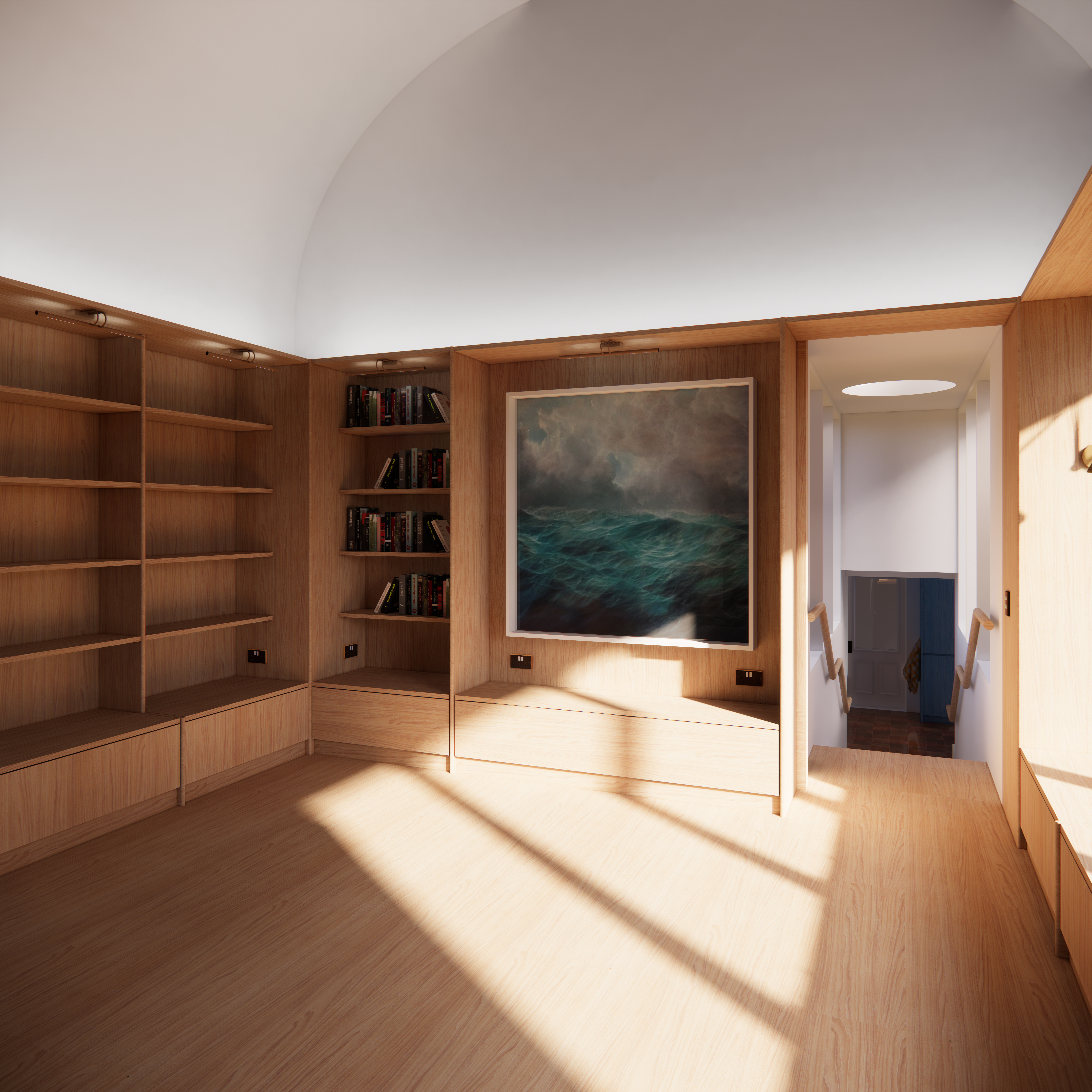 A glazed threshold incorporating a short flight of stairs connects the existing house to the library, which sits on a promontory. Animated by a circular rooflight above, this transitional space mediates between old and new. A new sequence of naturally lit enfilades establishes layered sightlines from the house, through the library, and outward to the surrounding fields, linking Sliabh an Iolair, to the west with the Iveragh Peninsula to the east. The barrel-vaulted ceiling draws the eye upward, imbuing the interior with a calm, reverential atmosphere.