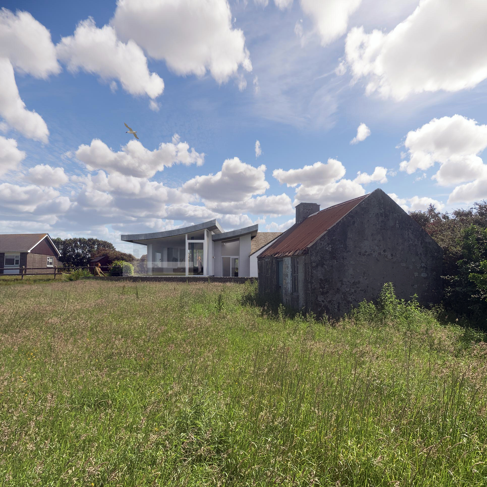 nternally, the new living space rises gently toward the view, its ceiling plane lifting to guide the eye outward. This considered gesture frames sea, sky, and land as integral elements of the everyday interior experience, rather than a distant backdrop.