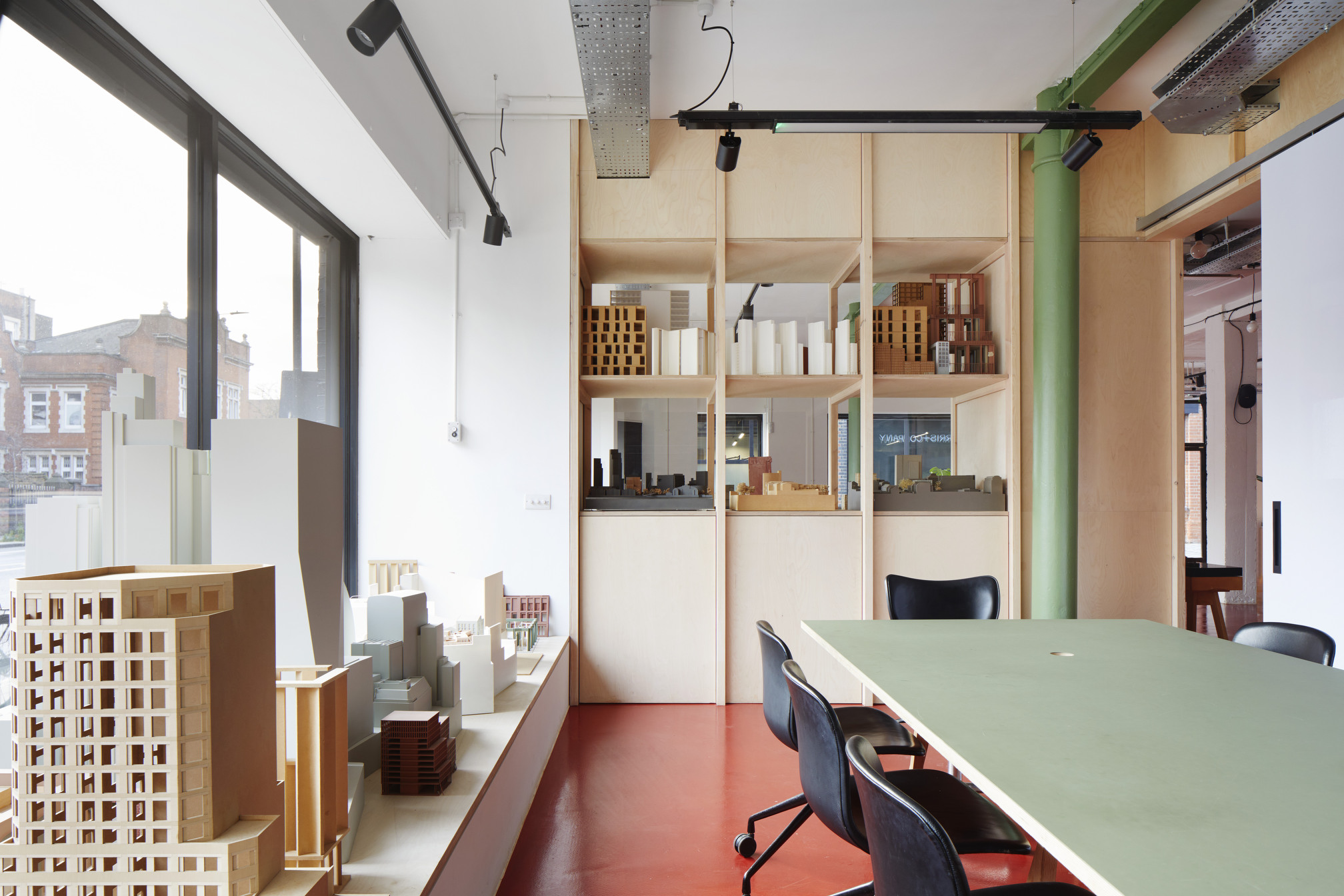 The basement houses a material archive, model workshop, photography studio, and ‘end-of-journey’ facilities — much of it constructed using repurposed joinery from previous studio fit-outs, extending the life of materials already in circulation.