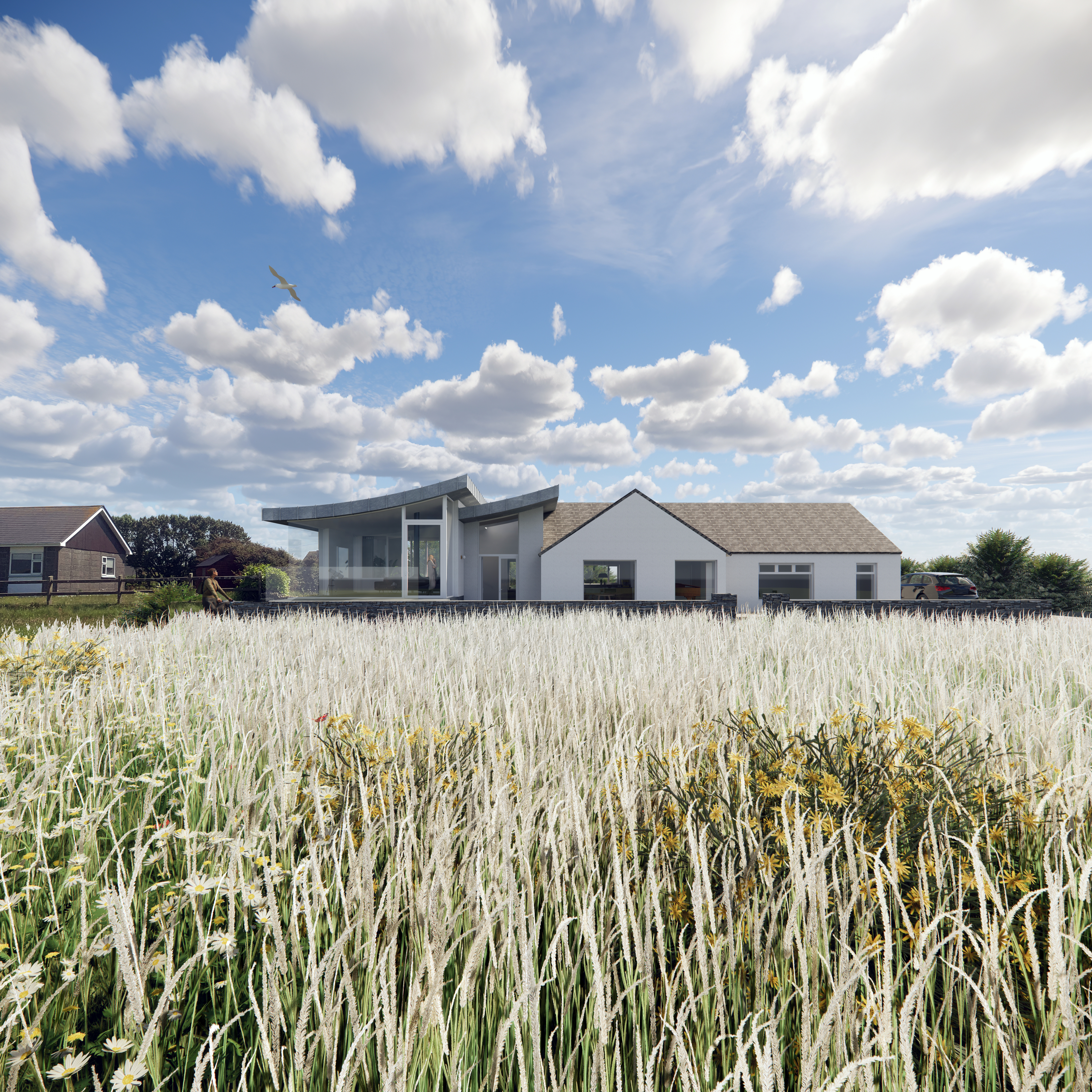 The proposed extension is composed as a pair of mono-pitched volumes, their white rendered forms recalling the lime-washed solidity of traditional single-storey structures found in rural Ireland. A gently curved zinc roof moderates the profile of the addition. Its soft arc reflects the changing coastal light and introduces a subtle sense of movement, allowing the new form to settle into the skyline without competing with it.
